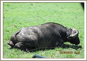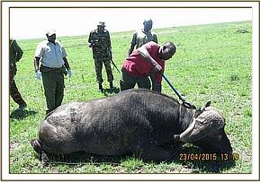 The anesthetic was achieved by use of 24mgs Diprenorphine administered intravenously through a prominent ear vein. The buffalo woke up after two minutes and moved away.