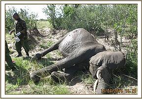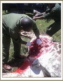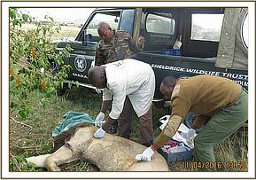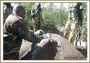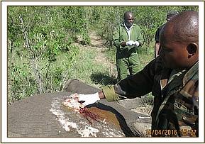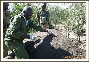 Immobilization was achieved by use of 12mgs etorphine hydrochloride delivered in a 1.5ml daninject dart. Darting was done from a vehicle. He remained calm after darting before giving in to effects of drugs after seven minutes. He assumed left lateral recumbency affording us good opportunity to examine the injured side.