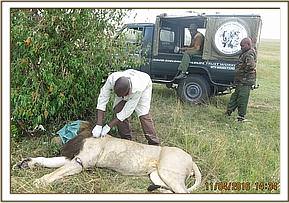 Restraint was achieved chemically by use of a combination of 6mg medetomidine hydrochloride and 400mgs ketamine hydrochloride delivered in a 3ml Dan inject dart. Darting was done from a vehicle. He remained calm after darting before the drugs taking full effect in seven minutes. The two brothers were scared away to give room for him to be attended to. They were in good condition though. Examination revealed an alopecic patch extending from his belly on either side of his abdomen towards the flanks. This appeared to be mange infestation. Additional injuries were seen on his left forelimb and dorsally on his back that appeared to have been caused by warthog tusk as they wrestled one down.