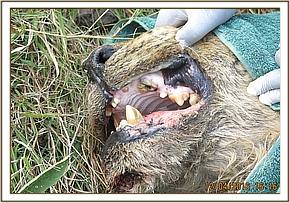 Examination revealed he had picked a fight probably in territorial conflicts with other males sustaining several injuries. The wounds were septic with maggots infesting which were manually removed. The distal part of the tail had to be amputated as it was getting necrotic. Examination of the oral cavity revealed injured tongue, with several teeth missing. Almost all the incisors were worn off. Three of the four canine teeth were missing with the only remaining being severely degraded and infected. There was evidence of advanced degree of degradation of the other teeth. All these were attributed to geriatric changes as this lion appeared old.