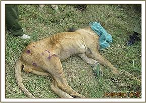 This male was found alone lying in a small bush, emaciated and in pain. His face bore fight wound injuries and purulent stuff was drooling from his mouth.