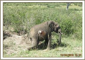 This elephant was in a big herd comprising of several families. A whitish purulent stuff could be seen oozing from a septic wound on his right flank. He had not lost his body condition though.