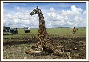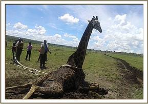 This giraffe was found on sternal recumbency both hind legs apart and struggling to stand. There was evidence he had struggled for a while and had splayed while crossing a steep trench. An attempt to adduct the hind legs and help him up by pulling was fruitless as every time he struggled the hind legs splayed. The posture he adopted indicated damage to both hip joints when he skidded trying to cross the trench. Several attempts were made to bring him up but all in vain. Both joints were considered damaged and could not support this massive bull.