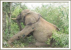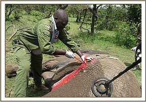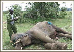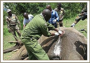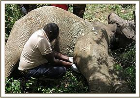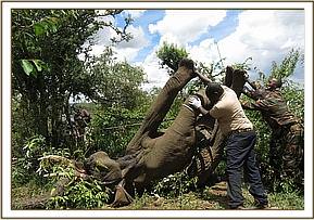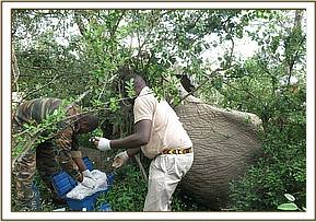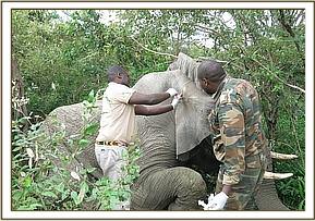 He was restrained chemically by use of 12mgs Etorphine hydrochloride delivered through a 1.5ml dan-inject dart.Darting was done from foot given this elephant was in a thicket. It took eight minutes for the drugs to take full effect with the elephant assuming right lateral recumbency. He had to be turned over to facilitate easier examination of the affected limbs.