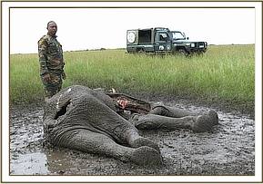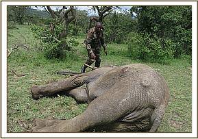 The carcass revealed some degree of emaciation with bony prominences easily discernible. The carcass was relatively fresh, less than 24hours old but hyenas and vultures had greatly scavenged it, leaving parts of skin and bones only. The tusks were intact and were retrieved by the Reserve rangers for accountability and custody.