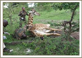 Restraint was achieved by use of a combination of 12mgs Etorphine hydrochloride and 50mgs Azaperone delivered through a 3ml dan-inject dart from a vehicle. It took ten minutes for the drugs to take full effect and the giraffe was roped and brought down for effective restraint.