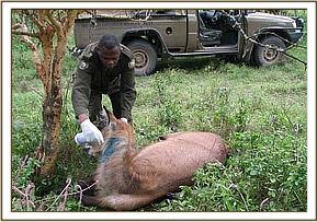 The wire was cut off then blood samples collected for diseases monitoring. The animal was then revived from anaesthesia and released.