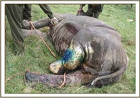 The animal was then revived from anaesthesia using 48mgs of Diprenorphine hydrochloride combined with 5mgs of Atipamezole hydrochloride then supported to rise up using ropes. It will be monitored for the time being to check on its progress after the treatment.