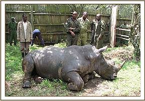 The rhino was revived from anaesthesia using 24mgs of Diprenorphine hydrochloride combined with 10 mgs of Atipamezole hydrochloride administered through the superficial ear vein. Another 12mgs of Diprenorphine was administered intramuscularly to enhance a quick recovery from anaesthesia. Another 50mgs of Narlophine hydrochloride, the animal woke up from anaesthesia after 3 minutes but it had to be assisted to stand and move into the crate. The loading process took along time because the animal could not support itself to stand. It was then transported and released into a boma for regular attention and care.