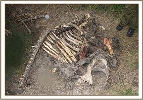 The rhino carcass was found lying in a small stream in Olkejorongoin area GPS location S 01 29, 365, E 035 09, 834 of Masai Mara National Reserve. It was reported by rangers on patrol but later on confirmed by the senior warden Mara. Both the horns were intact and were recovered and stored by the warden Mara before being forwarded to KWS station in Narok. The carcass had stayed for more than two weeks by the time it was sighted and most flesh had been consumed by scavengers. On closer examination, the ribs seemed to have a fracture line that had not healed properly and formed a callus hence it was suspected that the animal got injured and must have broken its ribs, this could be through a fight with another rhino.