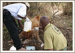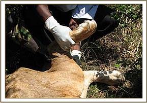 This was a case of an adult female lion that was reported to have been extensively injured by another lion from a different pride. It was in intense pain and preferred lying down most of the time. The vet was called to attend to this animal, after searching for sometime, the animal was found lying under a thick shrub. It was then anaesthetized by darting using 250mgs of Xylazine hydrochloride combined with 250mgs of Ketamine. it took 8 minutes for the drug to take effect and it became recumbent.