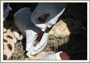 The cheetah was darted on the left thigh using 150mgs of Ketamine hydrochloride combined with 150 micrograms of medetomidine hydrochloride. It took about 10 minutes for the drug to take effect. Anaesthesia was smooth with good relaxation of muscles. The animal was immediately blindfolded and transferred to a cool shade for treatment.