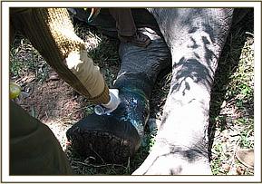 The rhino was examined and found to have a deep penetrating wound on the foot pad of the right hind limb; the wound was still fresh with minimal infection and was suspected to have been caused by a sharp object (probably a tree stamp) pricking through the foot pad. The wound was then treated using hydrogen peroxide and topical application of tincture of iodine and antibiotic spray. Other long-acting antibiotics, multivitamins and Dexamethasone were administered intramuscularly as part of the treatment. All other superficial wounds on the skin caused by filarial worms were examined and sprayed by antibiotics.