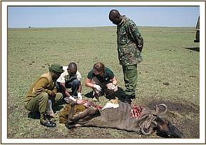 The buffalo was captured by darting using 7mgs of etorphine combined with 50mgs of xylazine on the right thigh, it became recumbent after about 6 minutes, the arrow was quickly removed and the wound cleaned and treated with antibiotics. The injury was only through the soft muscular tissues of the shoulder that was not life threatening except for the pain. Blood and tissue samples were collected before revival of anaesthesia. It was then revived from anaesthesia using 12mgs of diprenorphine hydrochloride combined with 5mgs of atipamezole hydrochloride administered through the jugular vein.