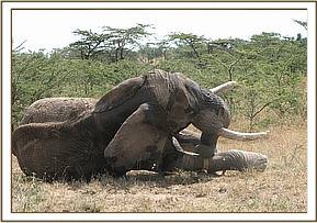 This was a case of an adult male elephant which had a penetrative wound on the left lateral side of the abdomen in Naibosho conservancy within the Mara ecosystem. The wound was already infected with a lot of necrotic debris and pus oozing out from openings. Similarly there was another wound on the right thigh which was beginning to heal but still had pus accumulations and swollen. The elephant was extremely weak and unable to move mostly preferring to remain standing under shrubs all day without any movement. The cause of the injury was not known but it was suspected that the animal could have been shot by an arrow-head while being chased out of the homesteads around that place or attempted poaching. The elephant was sighted by the scouts and manager of Naibosho conservancy who immediately informed the vet to attend to it. It was under a great pain and moved with a lot of difficulties.