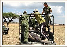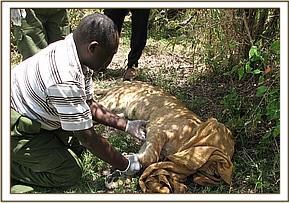 This was achieved by use of 16mgs etorphine delivered remotely through Dan inject darting system. Because of the terrain of the area, darting was done by foot. The drug took effect after eight minutes with the elephant assuming left lateral recumbency.