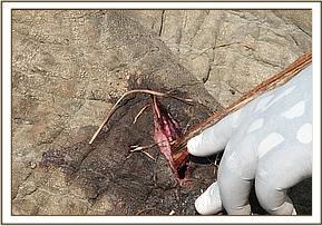 - Based on history and post mortem examination conducted, this elephant died of suspected spearing with poisoned laced spear. Quick tissue necrosis was as a result of high concentration of poison at the point of injury.