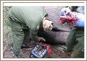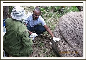 Restraint was achieved chemically by use of 13mgsetorphine hydrochloride delivered through a 1.5 dainjectdart.Darting was done from a vehicle. It took eight minutes for the drugs to take full effect with the elephant assuming sternal recumbency having moved to a small thicket. Though the posture was not the best, it presented a good position for wound examination and handling and this was done quickly before the elephant being flipped over to his lateral position for the remainder of the treatments.This was a spear wound which had turned septic with pus forming a pouch ventrally. An opening was created at the most ventral position of the swelling for effective pus drainage.