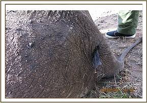 This young bull was located near a small thicket with other elephants browsing with a swelling on the lateral side of his right hind leg. He walked with difficulty although his body condition was still good. A small discharging wound was seen slightly dorsal to the swelling.