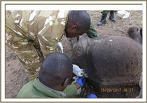 After considering all options and out of precaution, immobilization was ruled out as this would further complicate breathing and could easily lead to death. The team decided to administer anti-inflammatories remotely through darting by use of 3mldaninject darts.Two darts containing 6mgs dexamethasone sodium anti-inflammatories were prepared and delivered in turns from a vehicle. The needles were plain and the darts dropped off as soon as the drugs were delivered.