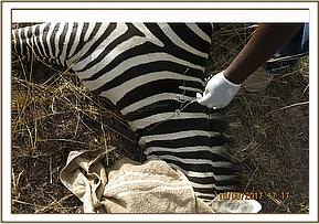 Done by use of 18mgs diprenorphine hydrochloride given intravenously through the jugular vein. She woke up within two minutes of reversal to join other zebras.