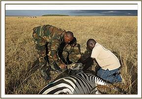 This zebra was seen by the veterinary team together with the Mara triangle rangers soon after collaring the lion. He had a snare round his neck.