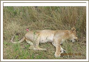 This lion was seen limping while walking by the Masai Mara National Reserve rangers. She with her other three sisters were nursing twelve young cubs. They called the mobile veterinary unit for assessment.
