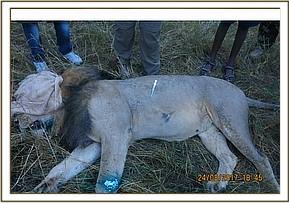 Restraint was achieved chemically by use of a combination of 4.8mgs medetomidine and 200mgs ketamine delivered remotely through a 3mldaninject dart.Darting was carried out from a vehicle. It took seven minutes for the drugs to take full effect with the lion assuming sternal recumbency. After confirming that he was stable, examination was conducted. He had a fresh bite wound on her back, sacral region of the spine. His left hind leg had no fresh injury but had poor musculature attributed to dystrophy of disuse. No fracture was detected.