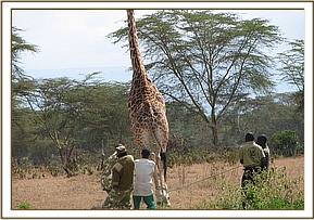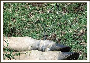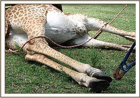 The other case was that of an adult male giraffe that had a loose snare wire on right hind limb just above the hoof, it had not inflicted any injury to the animal but it affected its movement and feeding. The animal was then captured by chemical restrain and the wire removed.