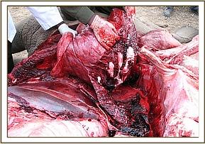 The KWS rangers being assisted by the conservancy workers and other staff helped the vet to open up the carcass for detailed postmortem. Human safety and precaution was the number one priority and everyone put on protective gear (hand gloves, overall, face masks and gum-boots), the animal was handled with great care.