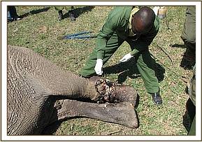 Treatment of a wounded sub-adult male elephant near Oloololo gate, Mara Triangle