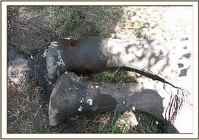 An adult male hippo was found lying dead in a small stream next Musiara gate in Maasai Mara NR. It had started decomposing and it had deep penetrating wounds on the abdomen and shoulder regions which it sustained during a fight by other males in the territory. It was suspected to have died of internal organ injuries particularly injuries to the lungs and heart. We advised the Mara management to pull the carcass out of water and burry it elsewhere to avoid contaminating the stream water.