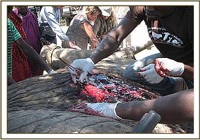 The elephant was darted from a vehicle using 17mgs of etorphine Hcl combined with 5000 i.u on the right thigh. The drug took effect after about 6 minutes and it became recumbent. The wound was then examined for the presence of any foreign material, the injury was slit opened using a surgical blade and probed by long haemostat forceps, we also used a metal detector to detect the presence of any metal, it was then pressed and cut open to drain all the pus and necrotic debris completely. Unfortunately, the animal had developed peritonitis and had extensive injuries to the internal organs that would not heal, the detector showed signs of an existing metallic object in the abdomen which could not be retrieved. Abdominal contents had spilled out and caused severe necrotic peritonitis. The elephant was therefore euthanized to save it from pain and suffering.