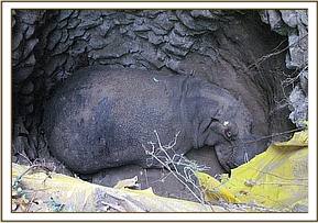 The worst incident occurred in Kichakani camp when an adult male hippo strayed into the camp at night and jumped into a 7 feet deep septic pit which was not well covered. The animal remained in the pit for a whole night before it was found the following day morning. Meanwhile it had struggled to get out of the pit but in vain. It sustained several bruises on the head and rump since the pit was narrow and squeezed. The injuries coupled with stress and shock led to death within a short time. By the time the KWS veterinary team arrived, the hippo had died. Postmortem examination revealed traumatic fatal injuries on the head and haemorrhage to the brain.