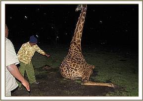 This case was reported to the mobile veterinary unit by mara triangle management. The adult male giraffe is said to have been unable to rise up despite spirited attempts since the morning of that day.He was said to be alert continuously attempting to rise.