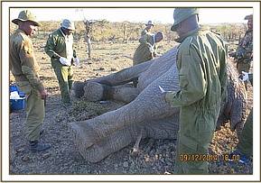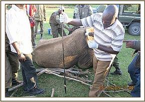 Reversal was achieved by administration of 30mgs Diprenorphine Hydrochloride through superficial ear vein. The elephant rose with a small assistance using ropes and walked into a nearby bush.