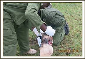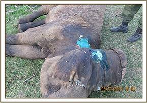 The elephant was immobilized using 15mgs Etorphine delivered through a 1.5ml Dan inject dart. The drugs took effect after eight minutes. Examination of the elephant revealed an old snare wound round his metacarpus. The snare had fallen off or had been removed. The wound was septic and required debriding with Hydrogen Peroxide and Gauze Swab. The wound was rinsed with water and tincture of Iodine was applied as a disinfectant. Oxytetracycline spray was also applied topically before the wound was packed with green clay. In addition, the elephant was treated with 15000mgs Amoxicillin antibiotic and 100mgs Dexamethasone Sodium anti-inflammatory, both were given intramuscularly.