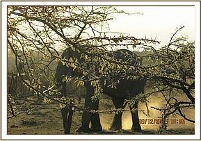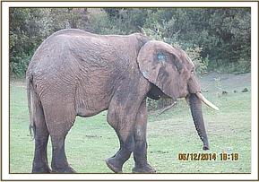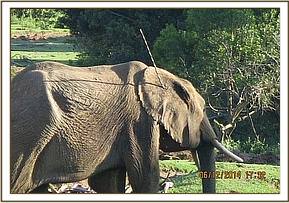 Though the elephant looked in good shape it appeared to be disturbed by a wound on his right forelimb and he was feeding along on Acacia twigs by a riverside.