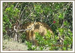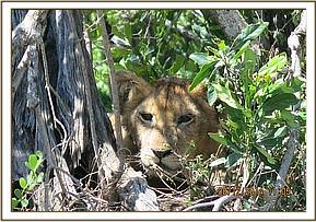 The lioness was found in the company of her two cubs and the other members of her pride on the edge of a small thicket. They appeared to have fed recently and were both the Lioness and her cubs were moderately affected by mange.