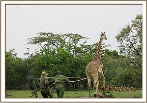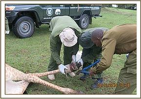Immobilization was achieved by use of 12mgs Etorphine Hydrochloride and 50mgs Azaperone delivered together using a 1.5ml Dan inject dart from a vehicle. The drugs took effect after seven minutes and with the help of ropes, the giraffe was brought down.