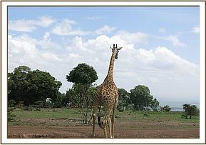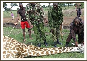 This adult female giraffe was seen with a snare round her neck by a team of game scouts at Kawaii area. They informed Mara triangle management who called the vet unit for help. This giraffe was seen in a herd of about twenty other giraffes with a wire snare round her neck. She appeared nervous on approach.