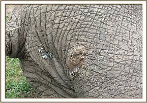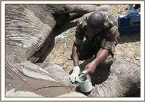 Restraint was achieved chemically by use of 18mgs etorphine hydrochloride delivered through a 3ml daninject dart.Darting was done from a vehicle. It took eight minutes for the drugs to take full effect with this elephant assuming left lateral recumbency.