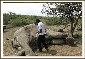 Restraint was achieved chemically by use of 10mgs etorphine hydrochloride delivered remotely through a 1.5ml daninject dart.Darting was carried out from a vehicle. It took eight minutes for the drugs to take full effect with this bull assuming left lateral recumbency. Examination revealed an approximately one-week old spear wound ventrally directed on his right thigh. This wound was getting septic. No foreign object was detected on probing.