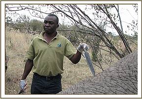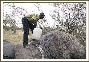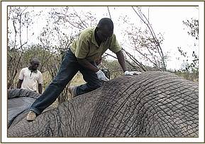 The elephant was darted from a vehicle using 18mgs of etorphine Hcl combined with 1500 i.u of hyaluronidase on the right hind thigh, the drug took effect after about 10 minutes but the elephant still could not go down and it had to be re-darted to achieve adequate immobilization.