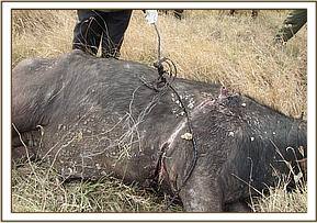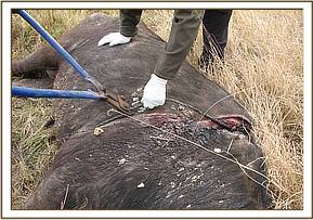 The buffalo was captured by darting using 5mgs of etorphine combined with 30mgs of xylazine on the left thigh, it became recumbent after about 5 minutes, the wire was quickly removed and the wound cleaned and treated with antibiotics. It was then revived from anaesthesia using 12mgs of diprenorphine hydrochloride combined with 5mgs of atipamezole hydrochloride administered through the jugular vein.