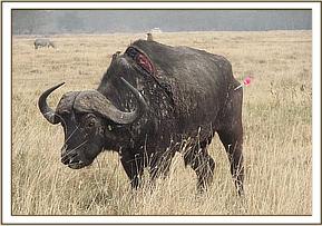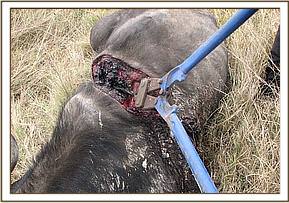 An adult male buffalo was sighted with a tight wire snare cutting through the shoulder/brisket muscles at Muya Courseway in Lake Nakuru NP. The wire had cut deep into the muscles causing a very deep and extensive wound over the shoulder.