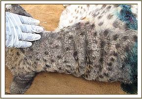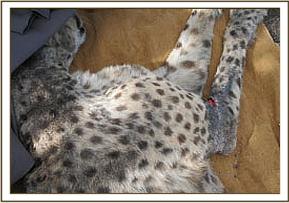 The cheetah had extensive loss of hair on several parts of the body particularly the head, face, neck, lower abdomen and legs.