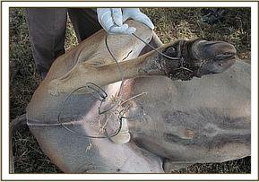 This was a case of an adult male eland that was trapped by a tight wire snare cutting through the fetlock joint of the right hind leg in Lentolia farm; the eland had difficulties of movement and had started loosing body condition due to constant pain and inadequate feeding. The wire had caused an injury to the leg.