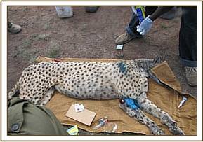 Treatment of an adult male cheetah (Acynonyx jubatus) of mange infestation in Olare Orok