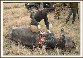 After treatment, the animal was revived from anaesthesia after about 60 minutes using 40mgs of Atipamezole Hcl administered intramuscularly; it took about 10 minutes to rise up and got into the nearby shrubs. It was to be monitored on a daily basis by security rangers who would report on its progress regularly to the veterinarian just in case it would require further treatment or any assistance to enhance its recovery.